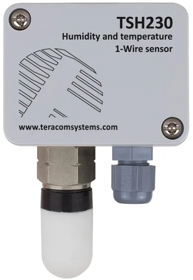 The TSH230 is a Splashproof sensor designed for measuring both temperature and humidity, utilising a 1-Wire interface. It employs a specialised capacitive element for accurate relative humidity readings and a band gap element for temperature measurements. These sensing components are integrated with a precise 12-bit analogue to digital converter, ensuring high-quality and reliable environmental data. When used in conjunction with suitable Ethernet or cellular controllers, the TSH230 becomes an excellent solution for humidity monitoring in environments demanding IP54 level protection against splashing water.