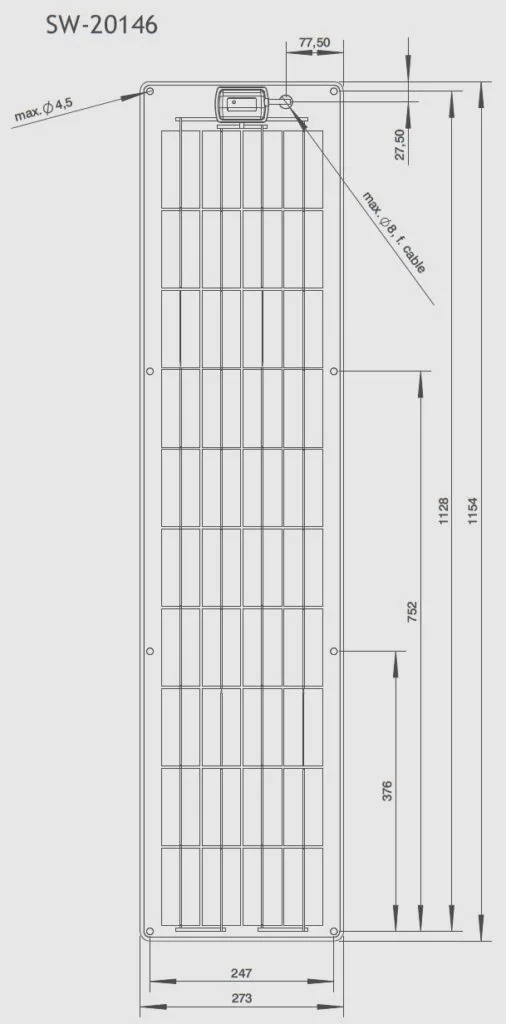 The carrier material is an Aluminium sandwich core. The new core material ensure the cells are perfectly supported and protected. The solar module can adapt to curved surfaces, with maximum curvature of 3cm/m module length. All modules can be screwed, glued or attached with clips and the module package includes white screw rosettes for countersunk screws to prevent damage to the module laminate by the screw head.