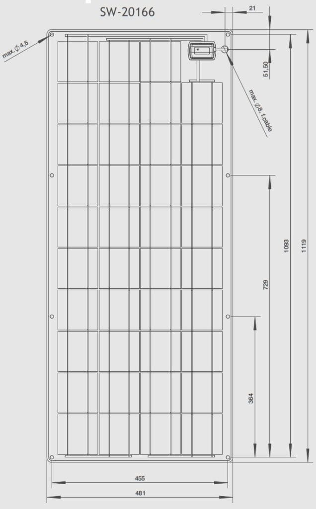 The carrier material is an Aluminium sandwich core. The new core material ensure the cells are perfectly supported and protected. The solar module can adapt to curved surfaces, with maximum curvature of 3cm/m module length. All modules can be screwed, glued or attached with clips and the module package includes white screw rosettes for countersunk screws to prevent damage to the module laminate by the screw head.