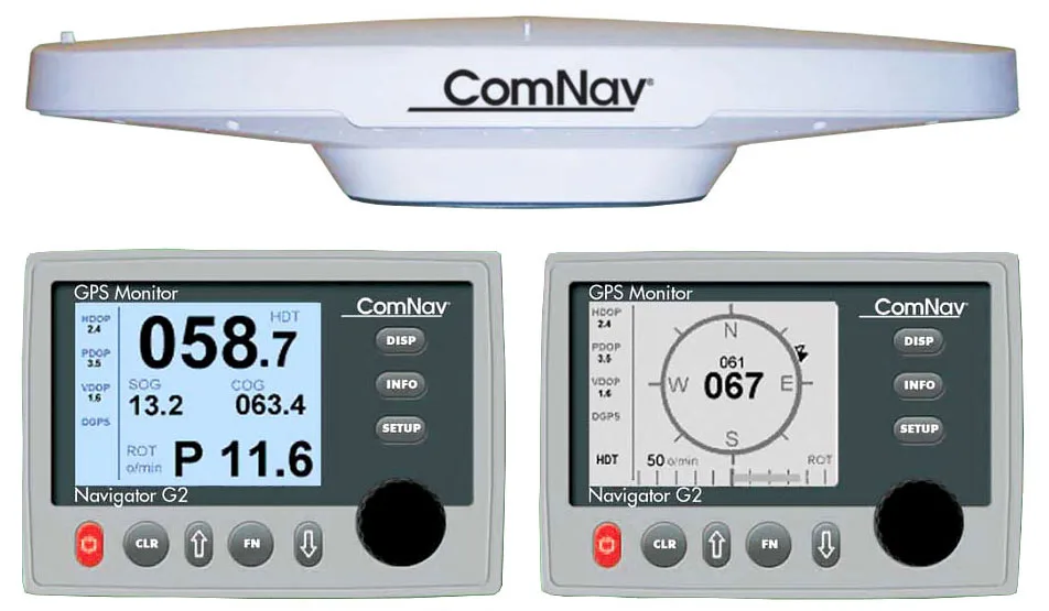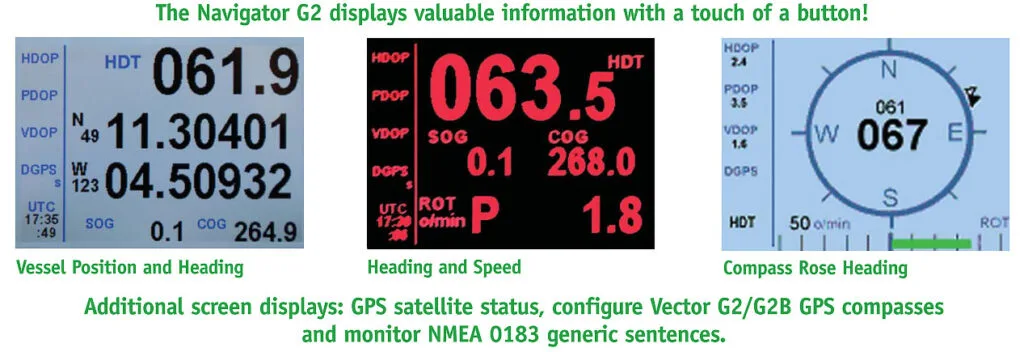 - Modes: Display pages include Compass Rose, Heading, Position, Advanced Heading, GPS Monitor, GPS Satellites Status & Auto Setup