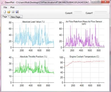 DAWN plotting software for presentation of downloaded data from ADAQ and OBD mini data logger. Shows logged data in graph format with zoom facility.