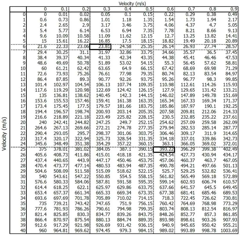 From the left hand column (velocity, in 1 m/s increments) and the top row (velocity, in 0.1 m/s increments), read across and down to find the corresponding differential pressure.