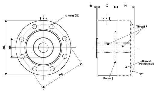| Model | Capacity | ØA | B | C | ØD | ØE | Thread F | ØG | N holes | H | J | Resonant Frequency (kHz) | Extraneous Load Limit (Mx, My or mZ) (nM) |