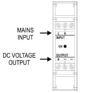 Line and Neutral connections to the top of the unit, positive and 2 negative output connections on the bottom. |