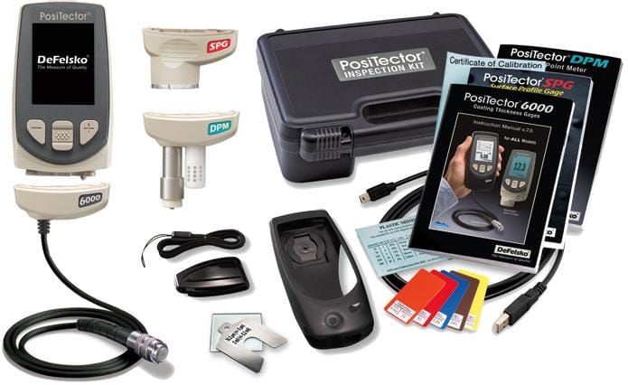 KITFS3 Inspection Kit contains: Advanced PosiTector Gage Body, PosiTector 6000 FS Coating Thickness Probe, PosiTector DPM Environmental Probe, PosiTector SPG Surface Profile Probe, Precision Plastic Shims, Glass Zero Plate and Metal Shim, Protective Rubber Holster, Wrist Strap, 3 AAA Alkaline Batteries, 3 Instruction Manuals, Hard Shell Case, Protective Lens Shield, 3 Long Form Calibration Certificates traceable to NIST, USB Cable and 2 Year Warranty on Body and Probes.