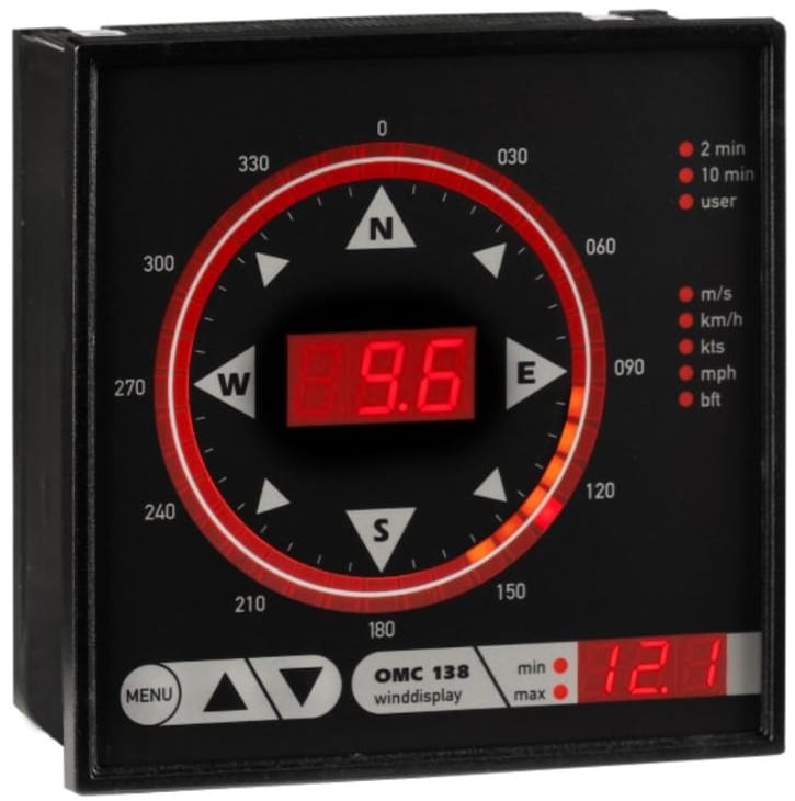 Standard digital wind display unit (land application) Combined digital display provided with a double LED circle for wind direction and wind variation. Further the display is provided with a display for wind speed and a display in the lower right corner for gust. Wind speed can be displayed in m/s, knots, mph, km/h or Beaufort, other choice can be made for averaging intervals from 2 minutes, 10 minutes or user selected Standard Power supply 24vDC.