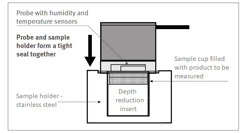 - Prior to measurements, place each product sample in a disposable sample cup with the cover on. Place the cups in the same general area as the probe. Allow for sufficient time for the samples to come to the temperature of the probe (usually room temperature). A frequent mistake is to measure product samples which have been kept overnight in a refrigerator without first allowing them to come to room temperature. Another mistake is to measure samples coming straight from a hot manufacturing process. To measure water activity at a temperature other than room temperature, place both the probe and the product samples in an incubator set at the desired temperature.