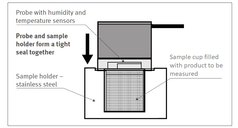 - Prior to measurements, place each product sample in a disposable sample cup with the cover on. Place the cups in the same general area as the probe. Allow for sufficient time for the samples to come to the temperature of the probe (usually room temperature). A frequent mistake is to measure product samples which have been kept overnight in a refrigerator without first allowing them to come to room temperature. Another mistake is to measure samples coming straight from a hot manufacturing process. To measure water activity at a temperature other than room temperature, place both the probe and the product samples in an incubator set at the desired temperature.