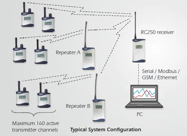 A wide range of transmitter units are available for V, mA, thermocouple, thermistor, and RTD inputs as well as units with integral sensors covering a wide range of different inputs and serial devices, eg ND-350 power meters. The RC250-MOD will receive inputs from any of the GEN II transmitters and can be used with the RP250GD repeaters to extend the coverage range.