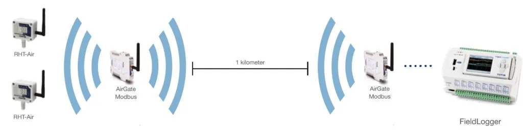 The RHT-AIR is a fully wireless solution for measuring temperature and humidity over long distances, allowing the configuration and reading of the parameters through the wireless network up to 1 km, bringing practicality and efficiency to the application. Units can be battery powered, or via 12-30vDC for continuous operation. Data can be collected by a central AirGate Modbus unit and relayed to a Fieldlogger or AirGate unit for connection to a remote Web server.