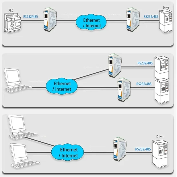 - Transparent Serial to Ethernet TCP/IP or UDP/IP.