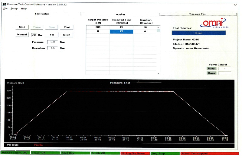 Hyperbaric Test of Subsea Sensors or Subsea Housings. Sustained 30 Bar Pressure for 2 Hours. A Test Certificate will provide details of the test and ensure the sensor/housing has been tested at pressures they will experience when deployed.
