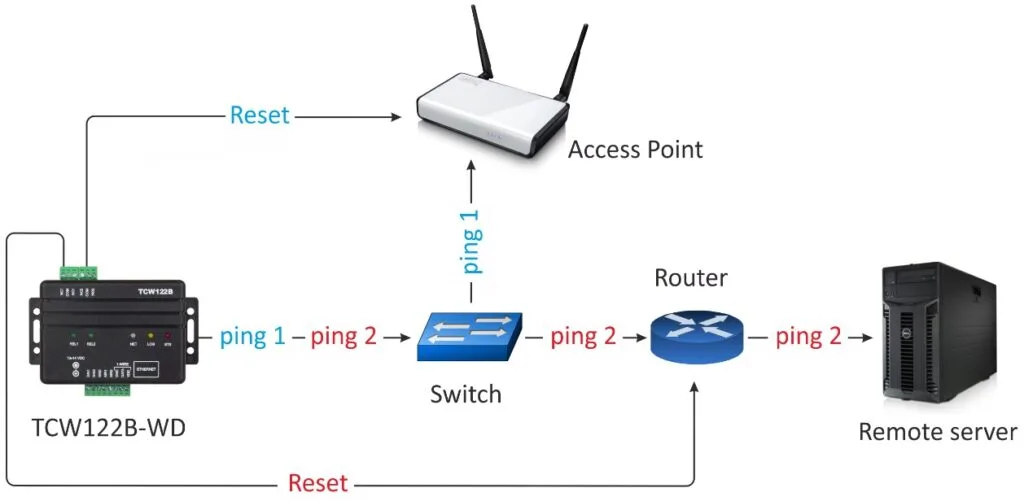The TCW122B-WD is a versatile IP monitoring module built for fail safe operation. It monitors the health of devices and networks by exchanging ICMP echo requests and replies (pings). When a ping fails to occur within a specified period, the module triggers a relay, enabling automated restarts of the monitored equipment.