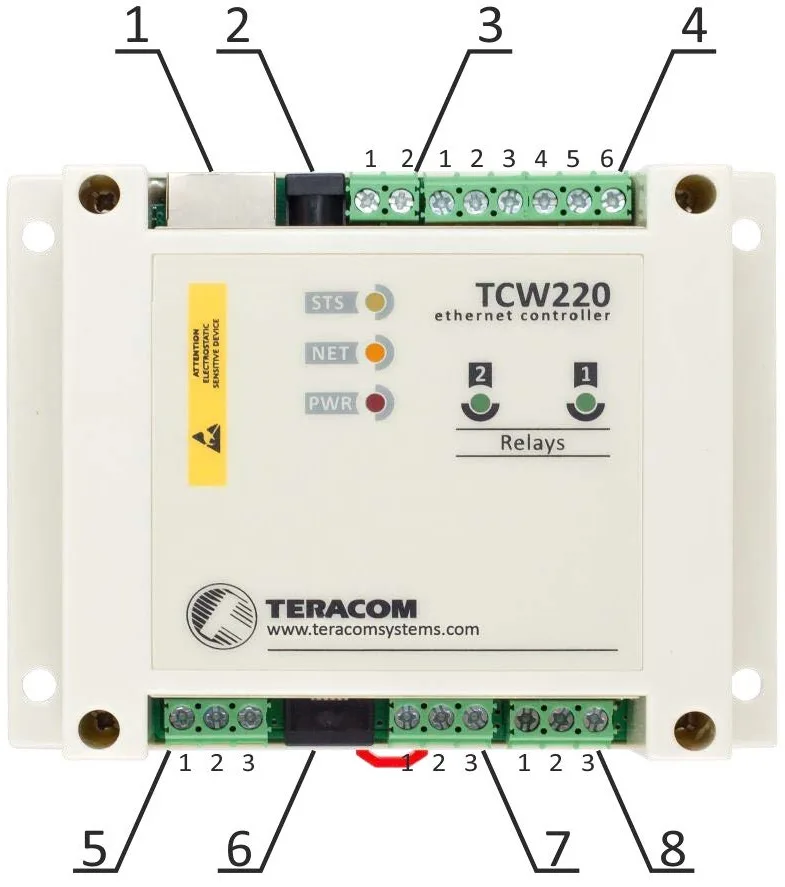 The TCW220 is an Ethernet data logger for general data acquisition, featuring two 10-bit analogue inputs, two digital inputs, and a 1-Wire interface for up to eight sensors (CO2, current, temperature, humidity, etc.). It also includes two Normally Open/Closed relays. All monitored parameters can be logged based on time or alarms, with a 36 day (minimum, 1-minute intervals) memory capacity. Logged data and real-time parameter values (in XML/JSON) can be periodically uploaded via HTTP POST.