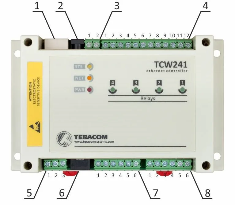 The TCW241 is an Ethernet IO module designed for remote monitoring and control, featuring Modbus TCP/IP support. This device is equipped with four digital inputs, four analogue inputs, and four relays. The TCW241 also include 1-Wire interface, supporting up to eight 1-Wire sensors, enabling the monitoring of parameters such as temperature, humidity, Carbon Dioxide, and AC/DC current. The module’s relays can be activated both remotely via a user-friendly web interface or M2M protocols, and locally based on a schedule, the status of a single parameter, or through custom functions involving up to four parameters.