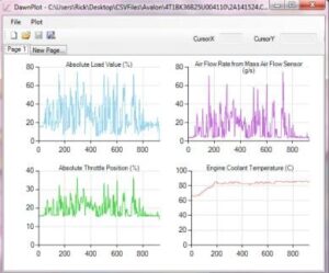 DAWN plotting software for presentation of downloaded data from ADAQ and OBD mini data logger. Shows logged data in graph format with zoom facility...