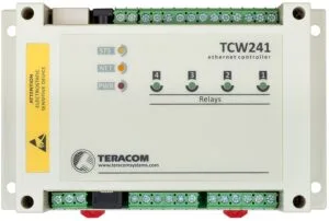 The TCW241 is an Ethernet IO module with an RJ45 Ethernet Port. It has four digital, four analogue inputs and 4 relay outputs with Normally Open and Normally Closed contacts. The TCW241 can also support up to Eight 1-Wire sensors, which can monitor temperature, humidity, CO2 levels, current or 4/20mA..